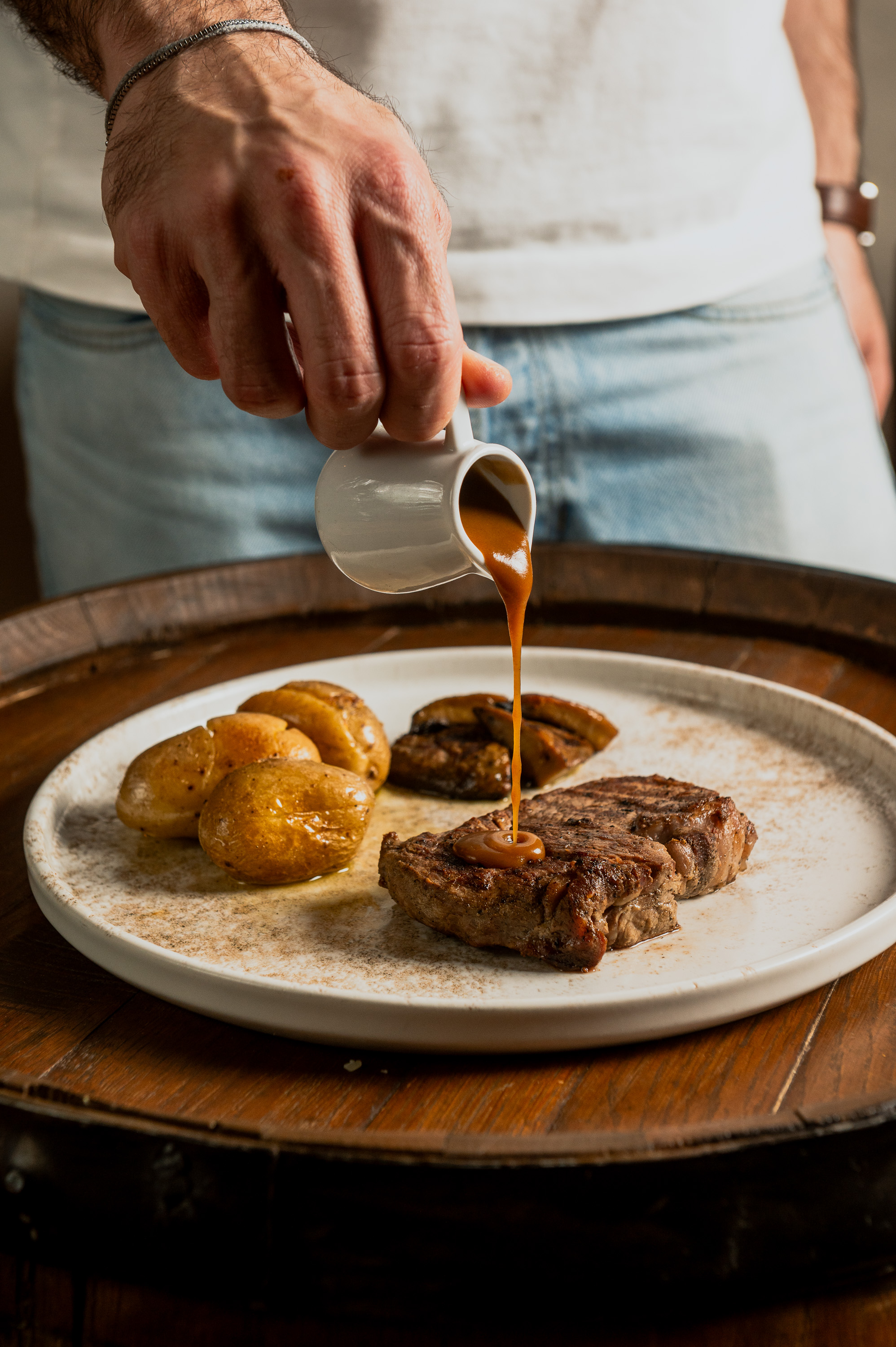 sous-vide with celery root purée, herb gravy & shallots