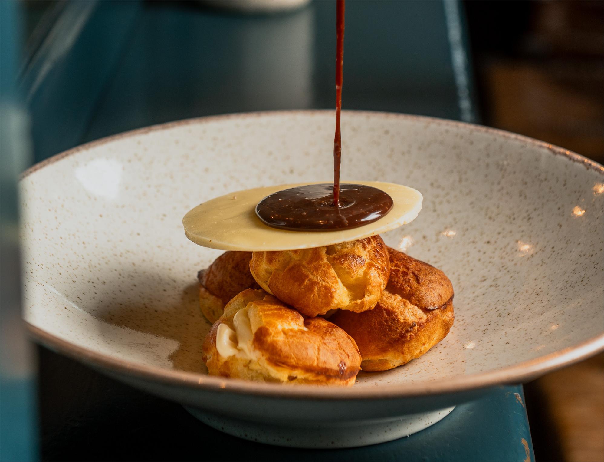 with handmade choux pastry, white chocolate & milk chocolate sauce